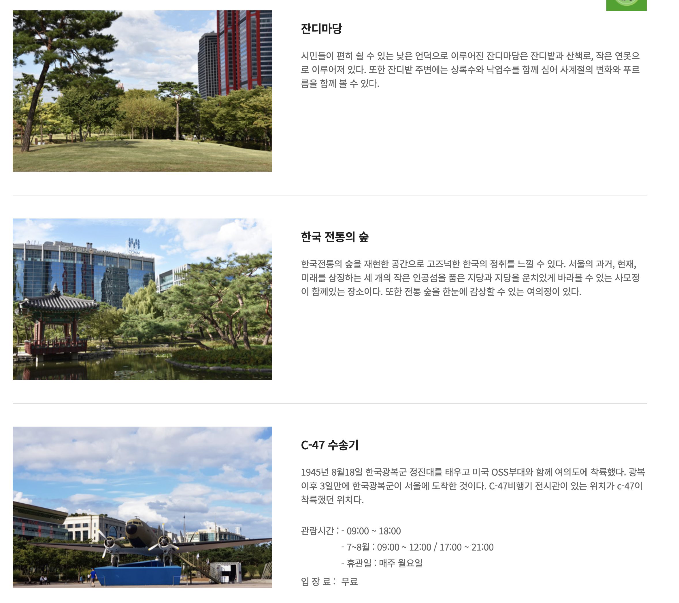 - 가는 방법: 지하철 5호선 여의도역 3번 출구에서 도보 13분, 여의도환승센터 하차 후 도보 3분