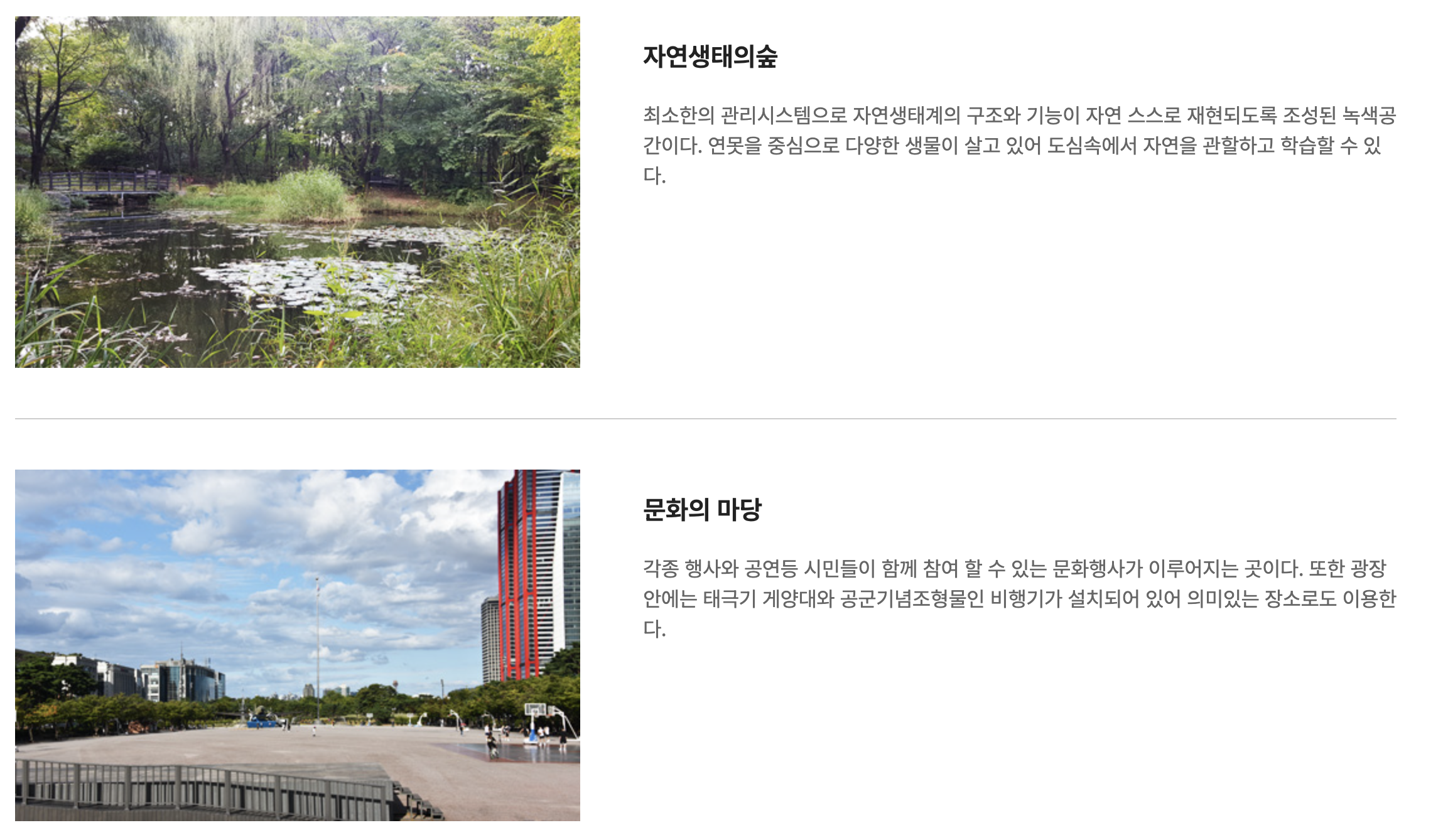 - 추천 활동: 잔디밭에서 피크닉 즐기기, 자전거 대여하여 공원 일주, 주말 문화 행사 참여