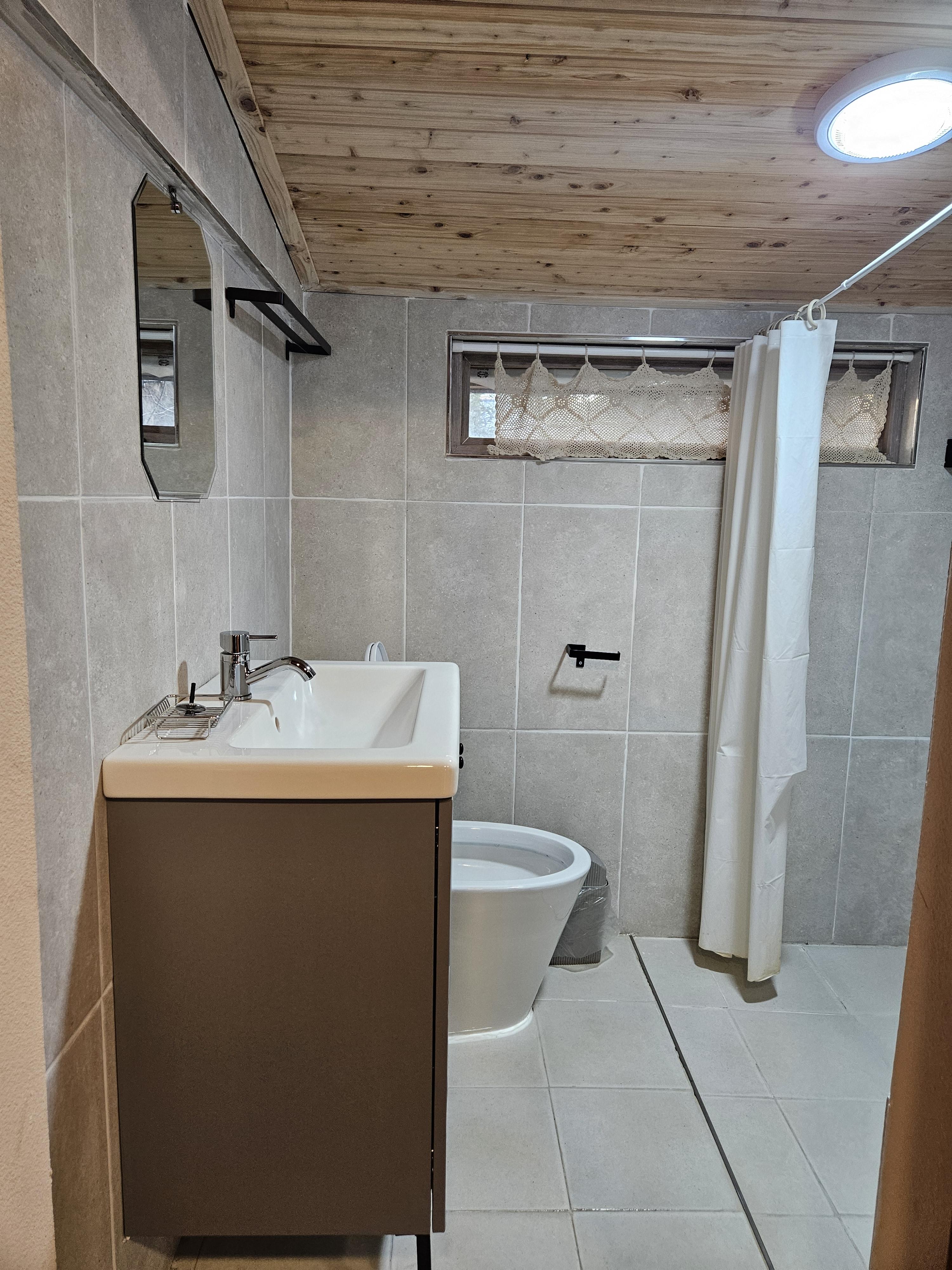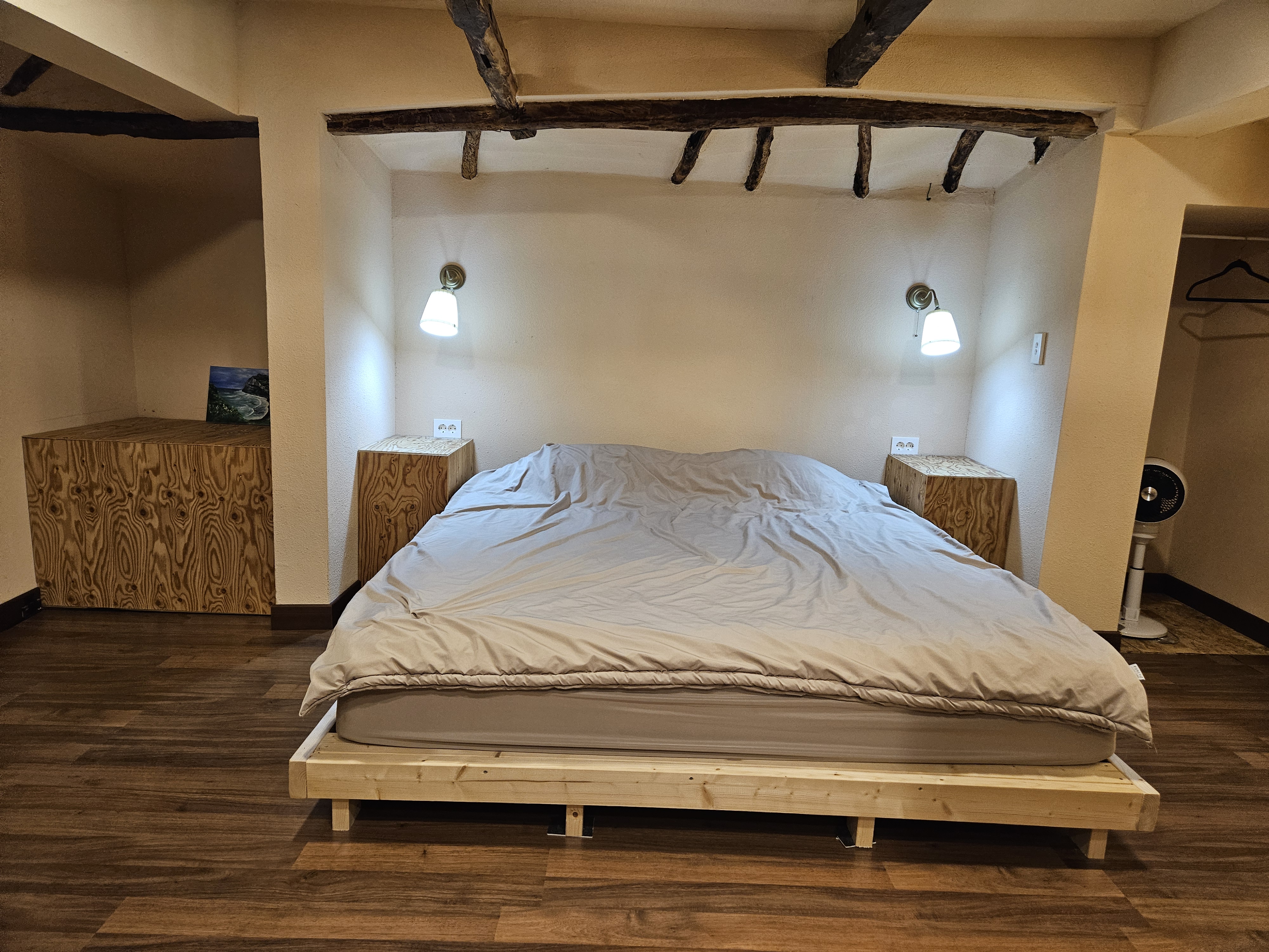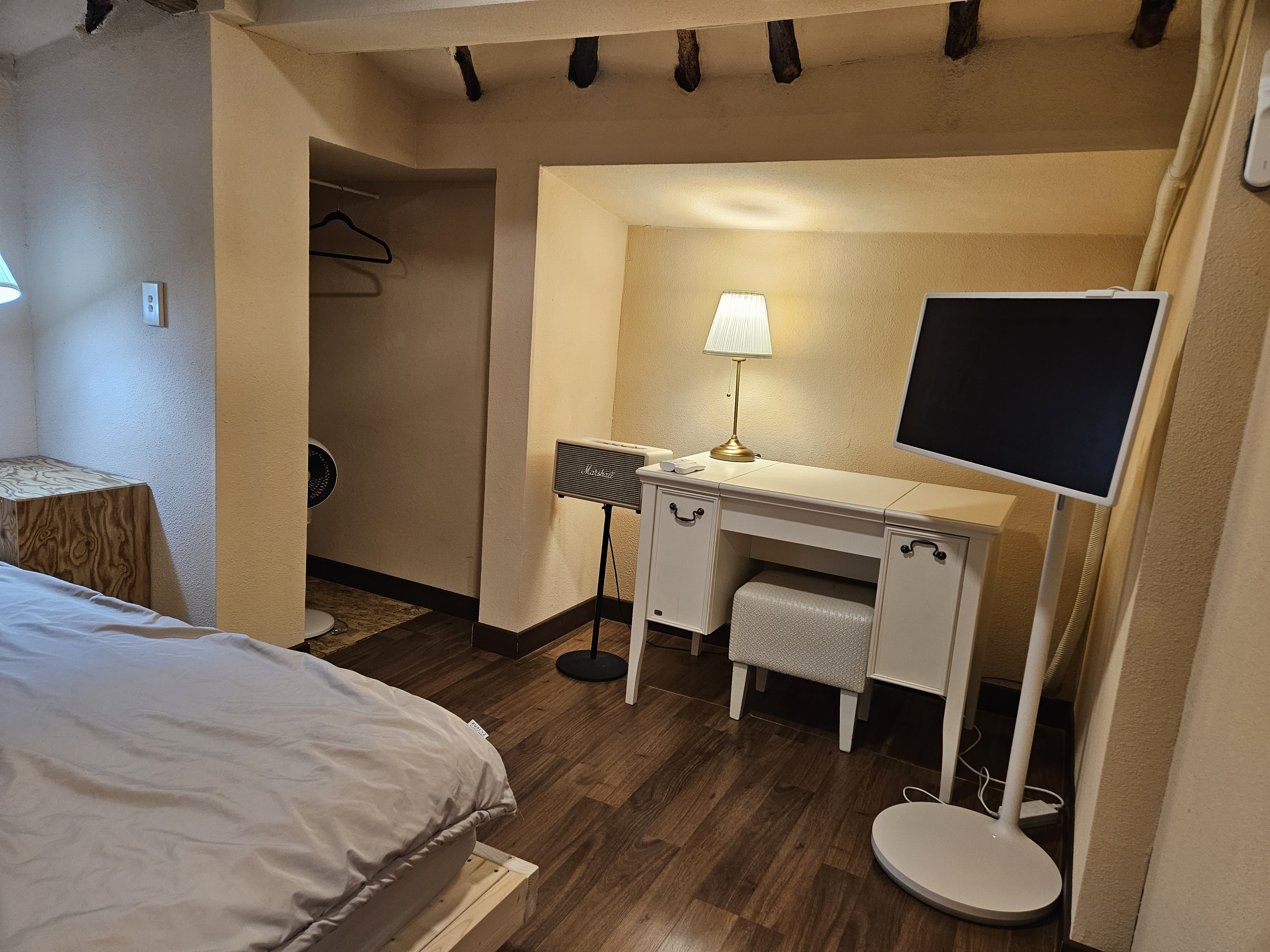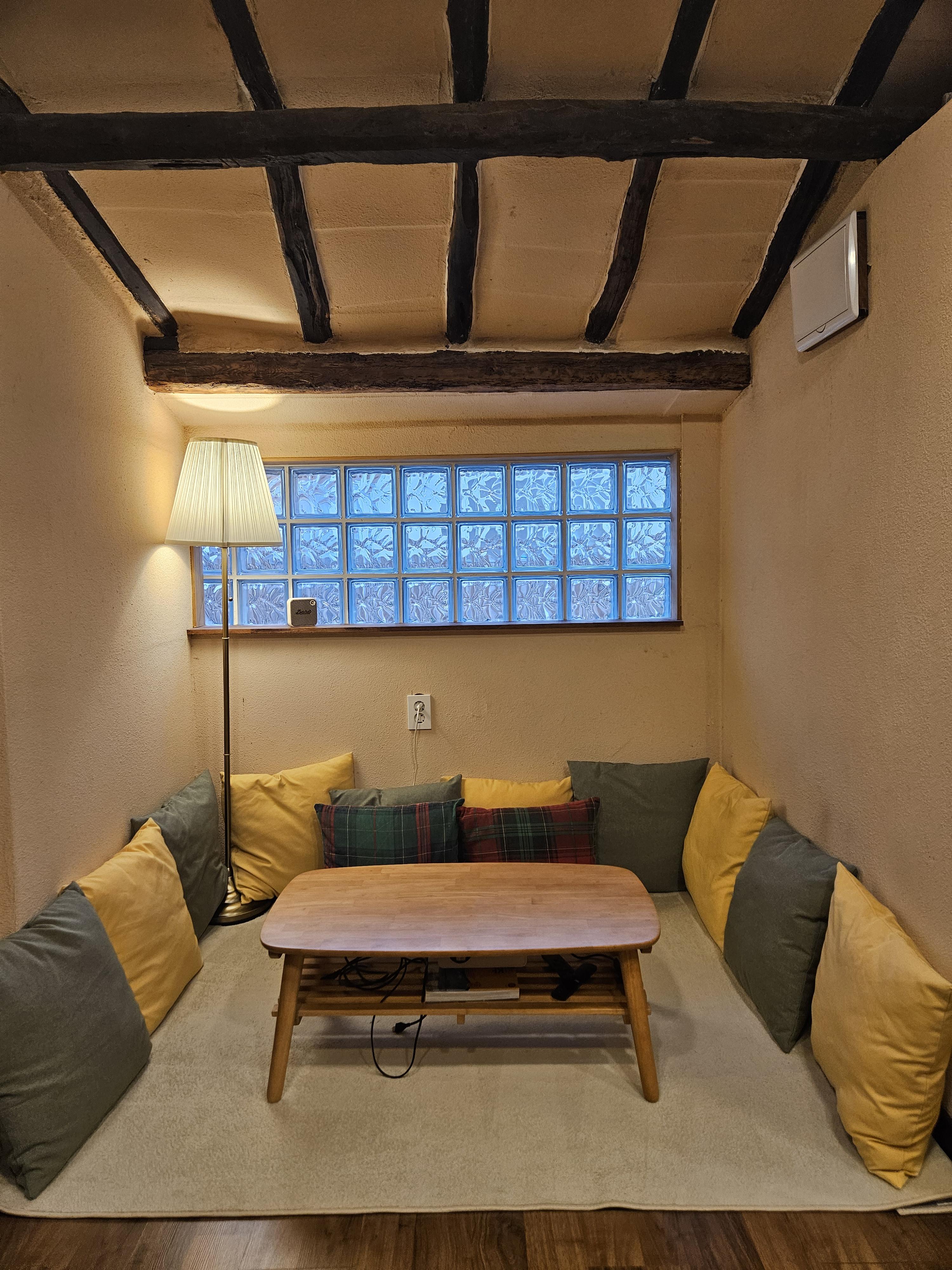 스테이유에 들어서면 따뜻한 베이지 톤의 벽과 전통 나무 대문이 한눈에 들어오는데요, 전통적인 제주 한옥의 분위기를 그대로 살린 감성적인 공간이라 사진 찍기에도 딱이에요. 침실은 은은한 조명과 포근한 매트리스로 꾸며져 있어 하루를 보내기에 편안했어요. 누우면 한옥 특유의 서까래가 보이는데, 그 순간이 정말 제주에서만 느낄 수 있는 특별한 힐링이었습니다. 또 스탠바이미 TV와 넷플릭스가 준비되어 있어 저녁 시간을 편안하게 보내기에도 좋았어요.
