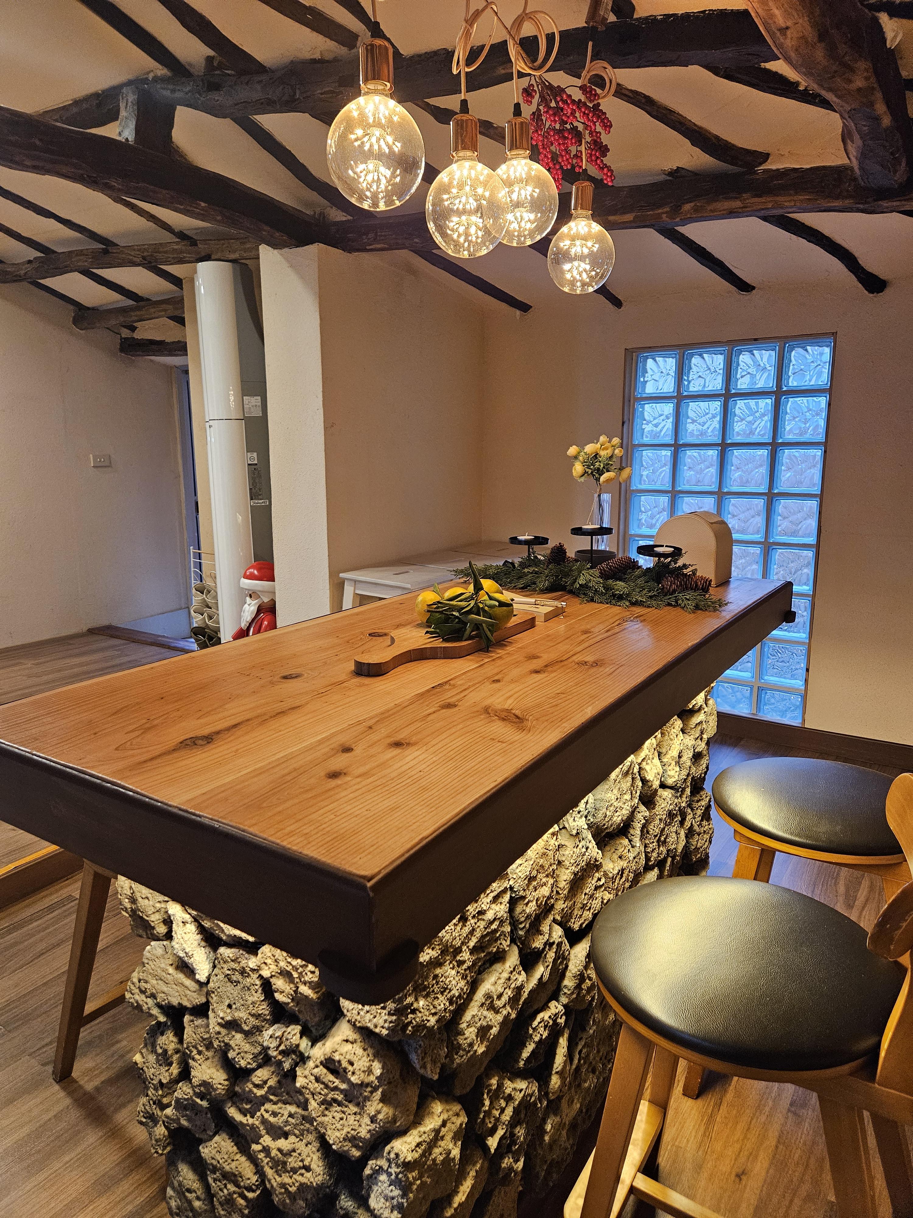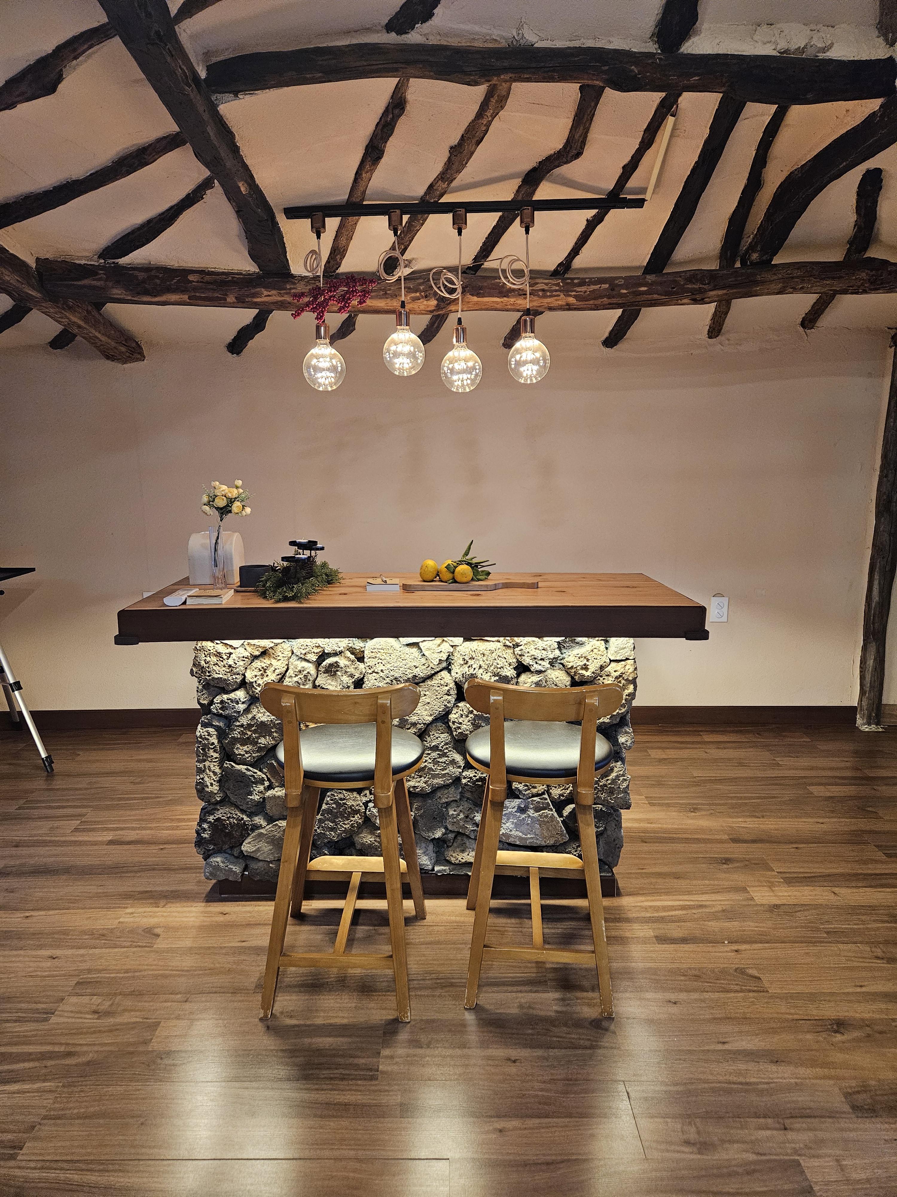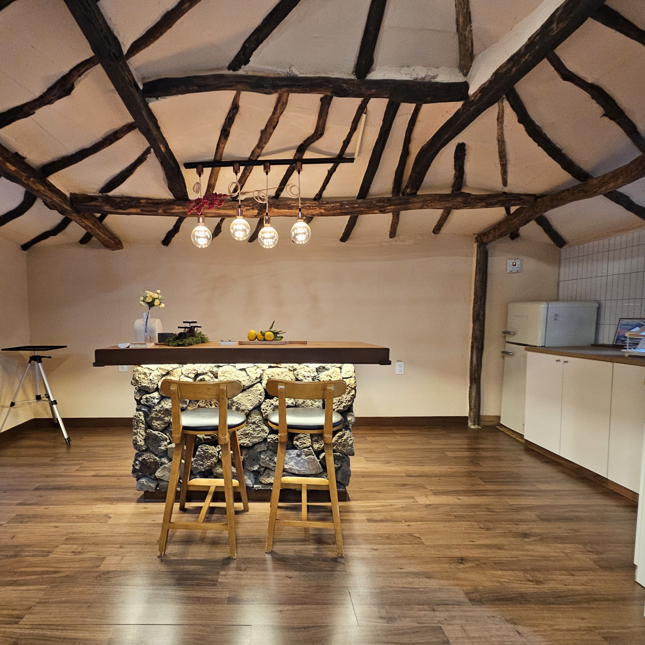 스테이유 한옥스테이는 전통 한옥의 고즈넉한 매력을 현대적인 감각으로 풀어낸 감성 숙소예요. 입구를 따라 들어서면 제주 돌담으로 둘러싸인 아늑한 공간이 펼쳐지는데, 이곳에서부터 이미 1박 동안의 힐링이 시작된 느낌이었어요. 거실 한편에는 아일랜드 식탁이 자리 잡고 있어서 전통적이면서도 세련된 인테리어가 인상 깊었답니다. 이곳은 성인 2명과 아이 2명이 머물기에 알맞은 크기로, 연인이나 가족과 함께하기 좋은 공간이에요.